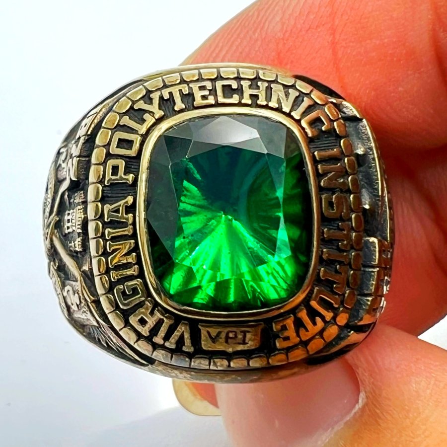 Nhẫn bá cấm vàng học viện công nghệ Virginia năm 1988 phôm bự hoa văn sắc nét đá xanh heni