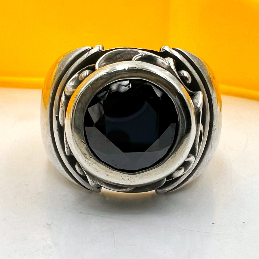 Nhẫn bạc 925 hiệu Aqua fortis phôm bự hoa văn sắc nét đá onyx đen đa giác rất đẹp, size 18
