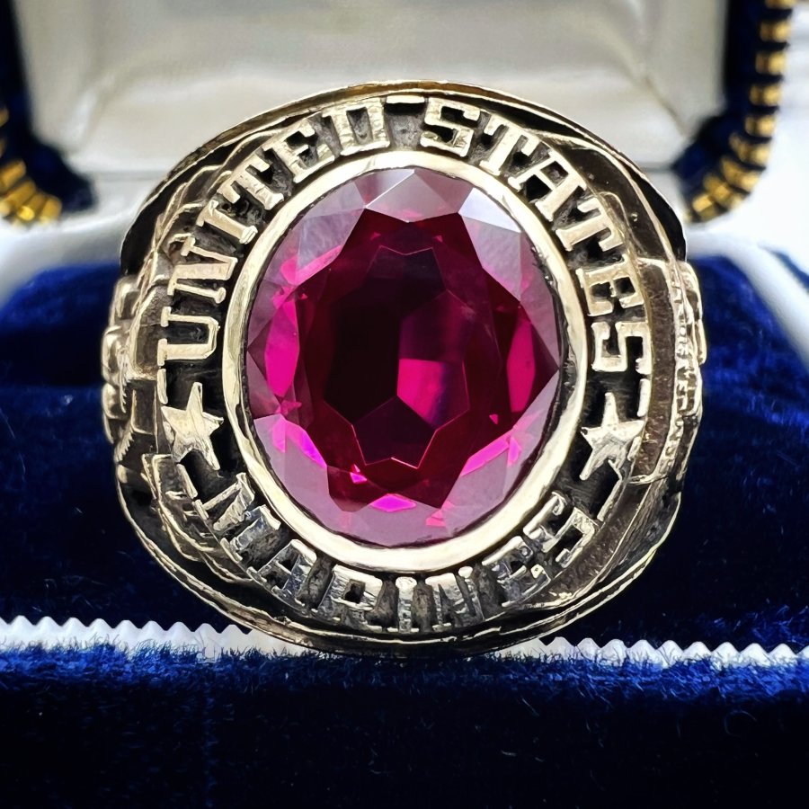 Nhẫn vàng 10k U.S Marines phôm bự hoa văn sắc nét đá đỏ huyết đa giác rất đẹp, size 20mm -