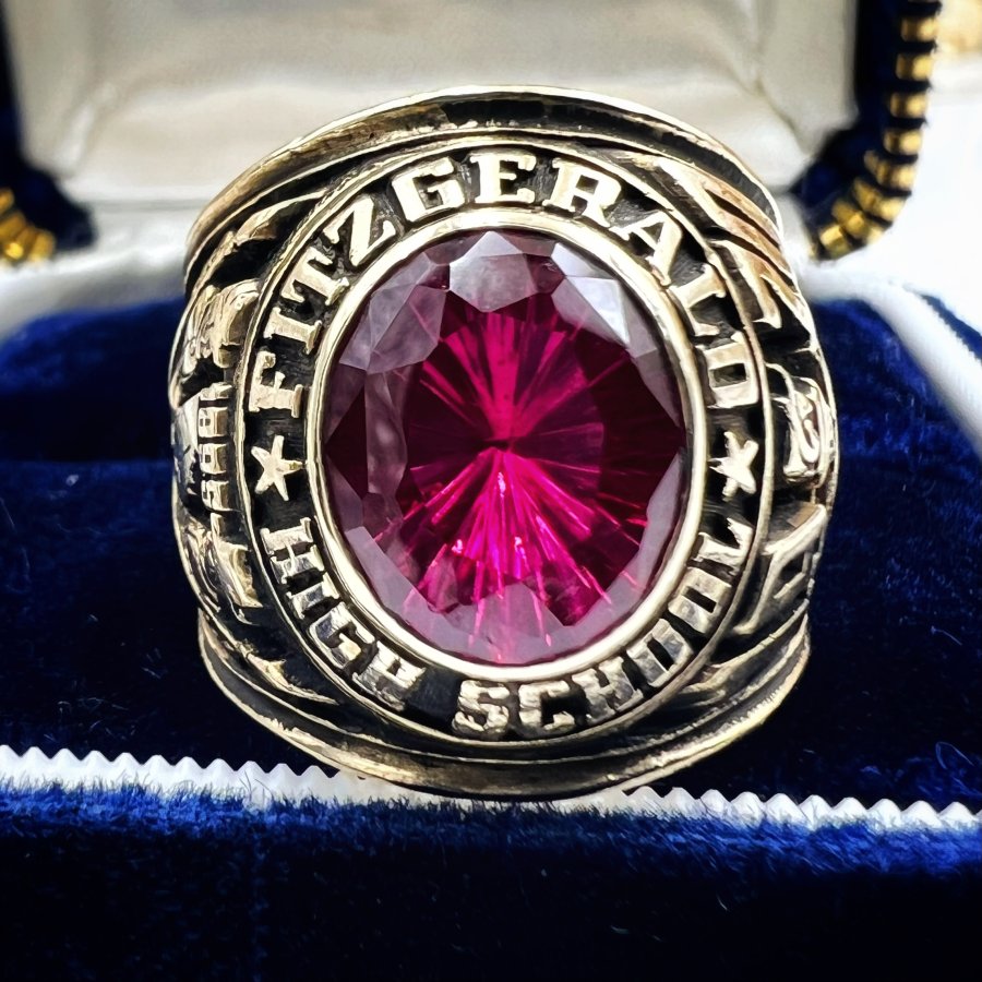 Nhẫn vàng 10k trường ********** Fitzgerald năm 1970 phôm bự hoa văn sắc nét đá đỏ tia đa giác