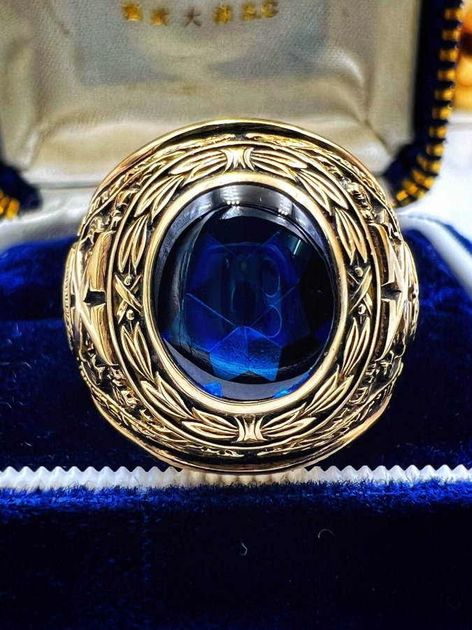 Nhẫn vàng 10k đại học Xavier phôm xưa to bự hoa văn sắc nét đá xanh mo rất đẹp, còn keo ló