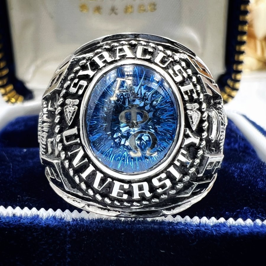 Nhẫn hợp kim đại học Syracuse năm 1976 mới tinh phôm bự hoa văn sắc nét đá xanh tia khảm l