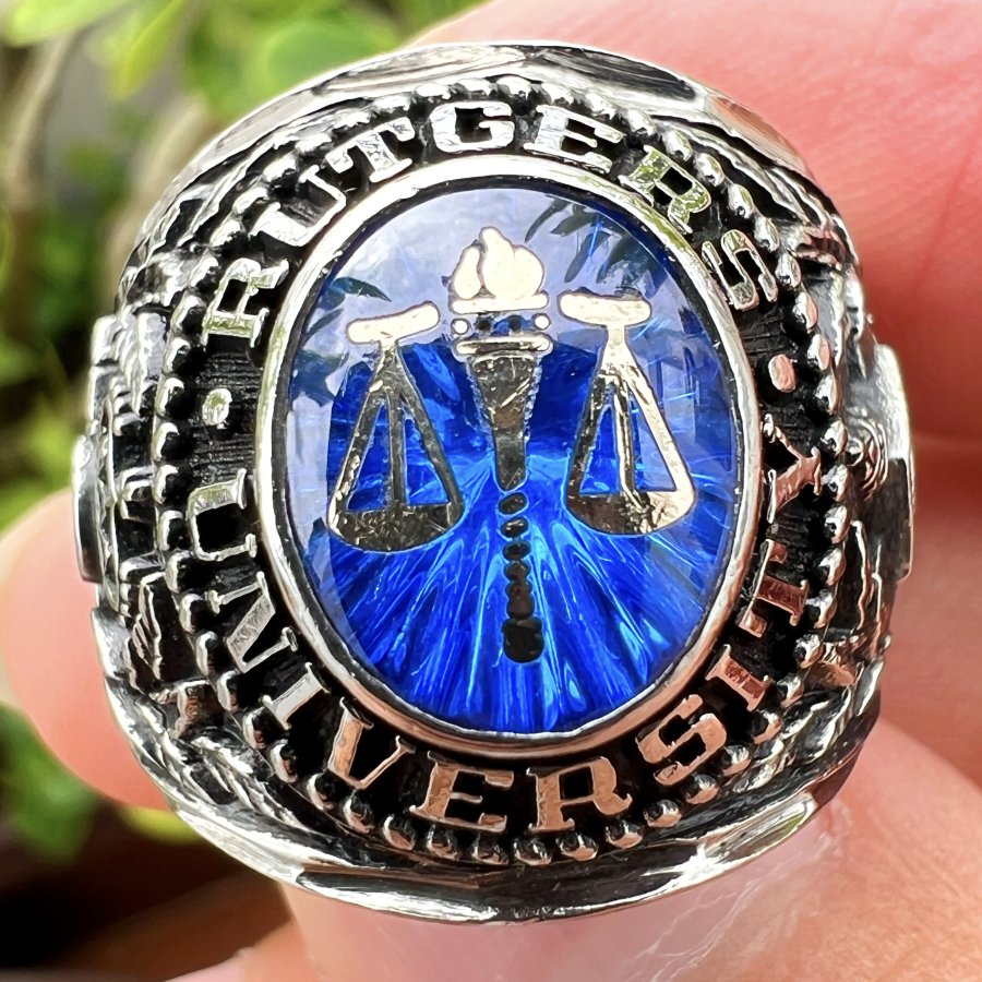 Nhẫn hợp kim đại học Rutgers năm 1977 phôm bự hoa văn sắc nét đá xanh tia mắt mèo khảm log