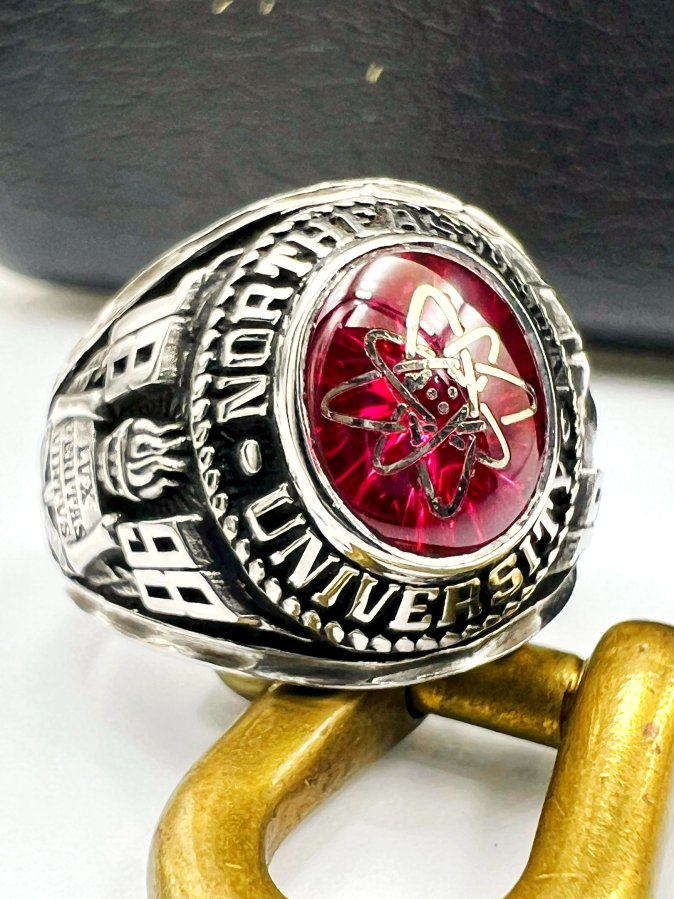 Nhẫn hợp kim đại học Northeastern năm 1975 hoa văn sắc nét đá đỏ tia khảm logo rất đẹp, si