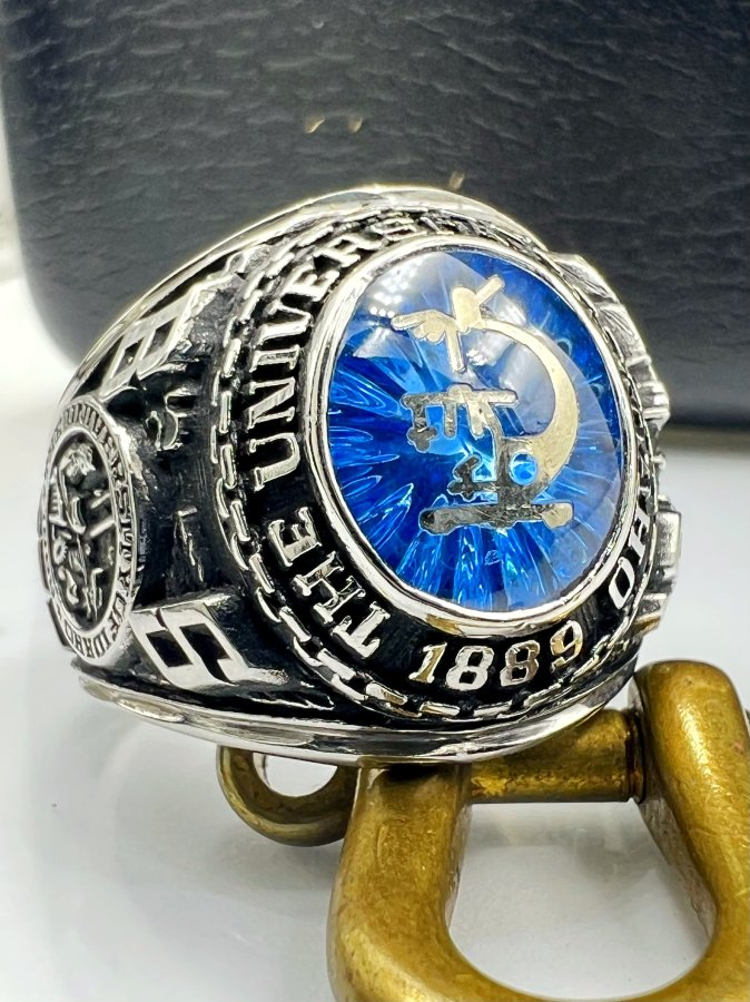 Nhẫn hợp kim đại học Idaho năm 1979 hoa văn sắc nét đá xanh tia khảm logo rất đẹp, size 19