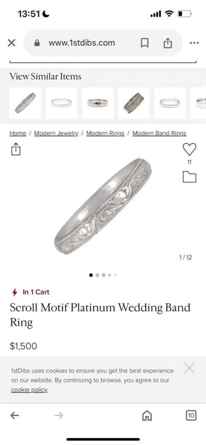 Nhẫn bạch kim và paladium 99% Nhật phôm tròn hoa văn khắc thủ công sắc nét rất đẹp, size 1