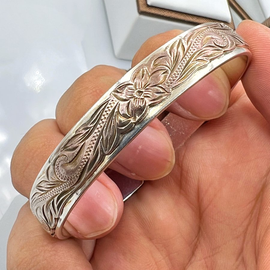 Vòng bạc 925 Nhật đemi 2 màu hiệu K hoa văn khắc thủ công sắc nét rất đẹp, free size 60mm