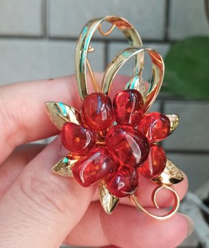 Cài áo Nhật hình bông hoa, khung bạc lắc kê vàng, đính 8 viên hổ phách siêu sang
