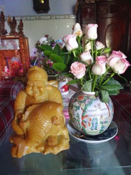 Tượng Thần Tài ôm cá chép to nặng bằng dá dâm bụt(loại đá mềm nhưng nặng).Cao 29cm nặng 8k