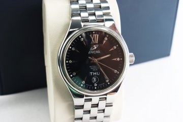 ĐH Nam ENICAR Automatic, mặt đen dòng 2 lịch, cọc số đính 11 viên Kim Cương, Size 39mm