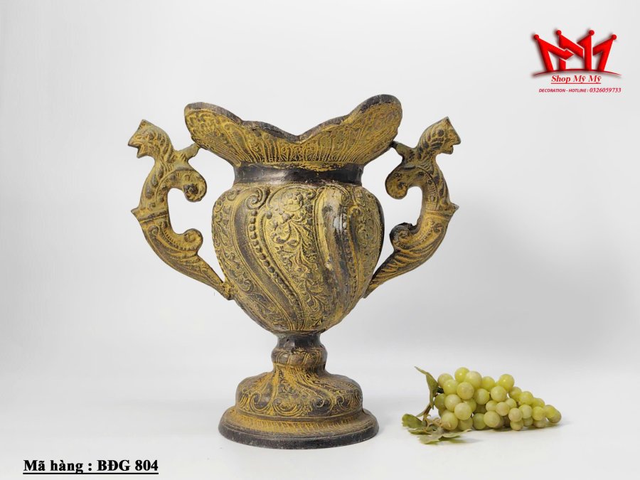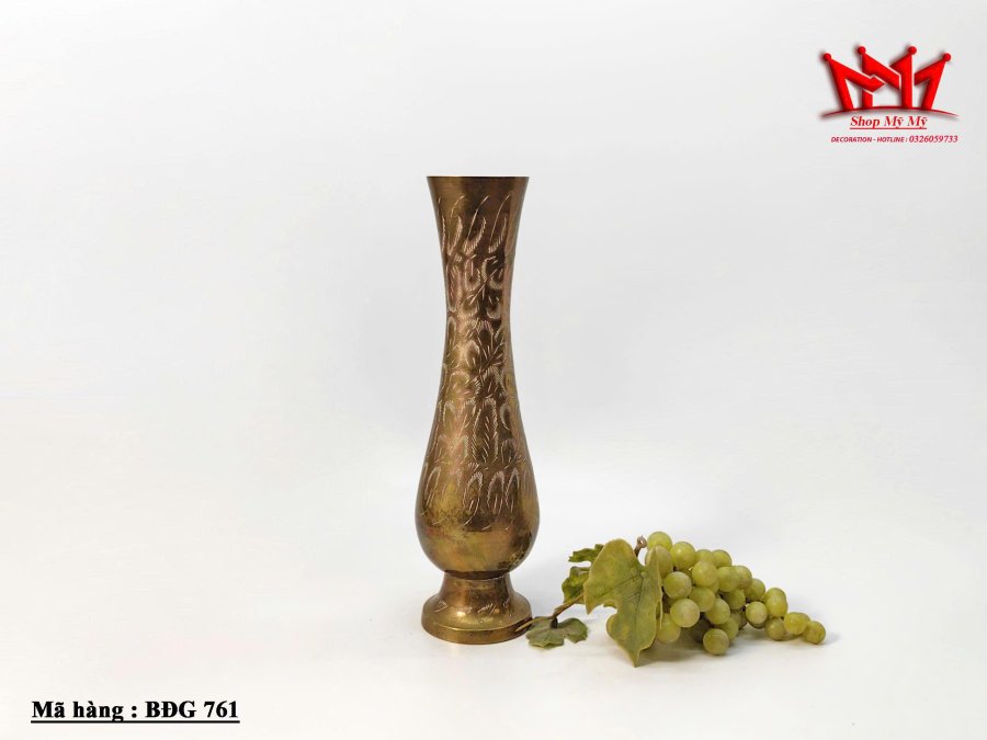 Chiếc bình hoa đồng thau chạm khắc thủ công.