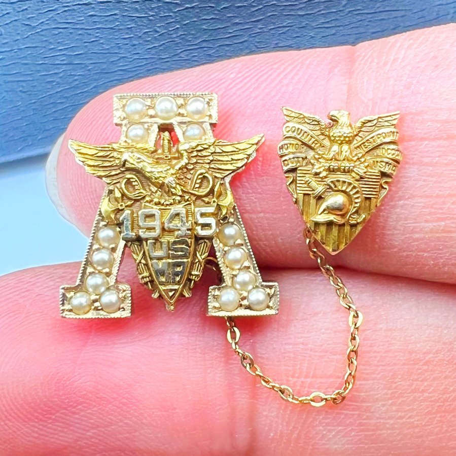 Huy hiệu (Pin) vàng 14k USMA (West Point) năm 1945 Mới cứng hoa văn sắc nét đính ngọc trai