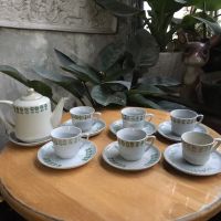 Bộ ấm chén sứ Hải dương hoa ngâu màu xanh 06 chén, 07 đủ đĩa, là bộ ghép nên hoa văn tương