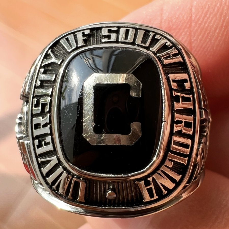 Nhẫn hợp kim đại học Carolina năm 1999 hoa văn sắc nét đá đen mo khảm logo rất đẹp, size 2