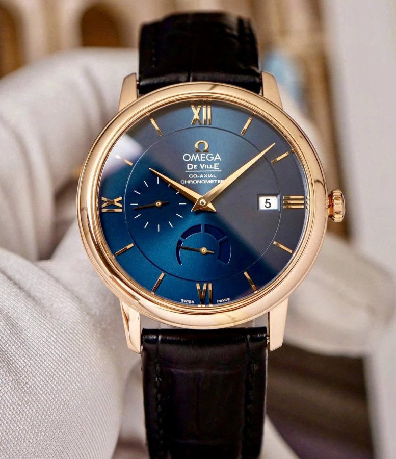 OMEGA DeVille Prestige Co-Axial 2627 xanh Blue,Ref: 424.53.40.21.03 .002, Vàng hồng đúc 18k
