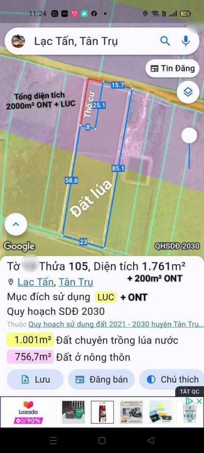 Bán đất xã Lạc Tấn , Tân Trụ tdt 1960m2 ( có 200m2 thổ) đường beton, có tường rào giá 2,2