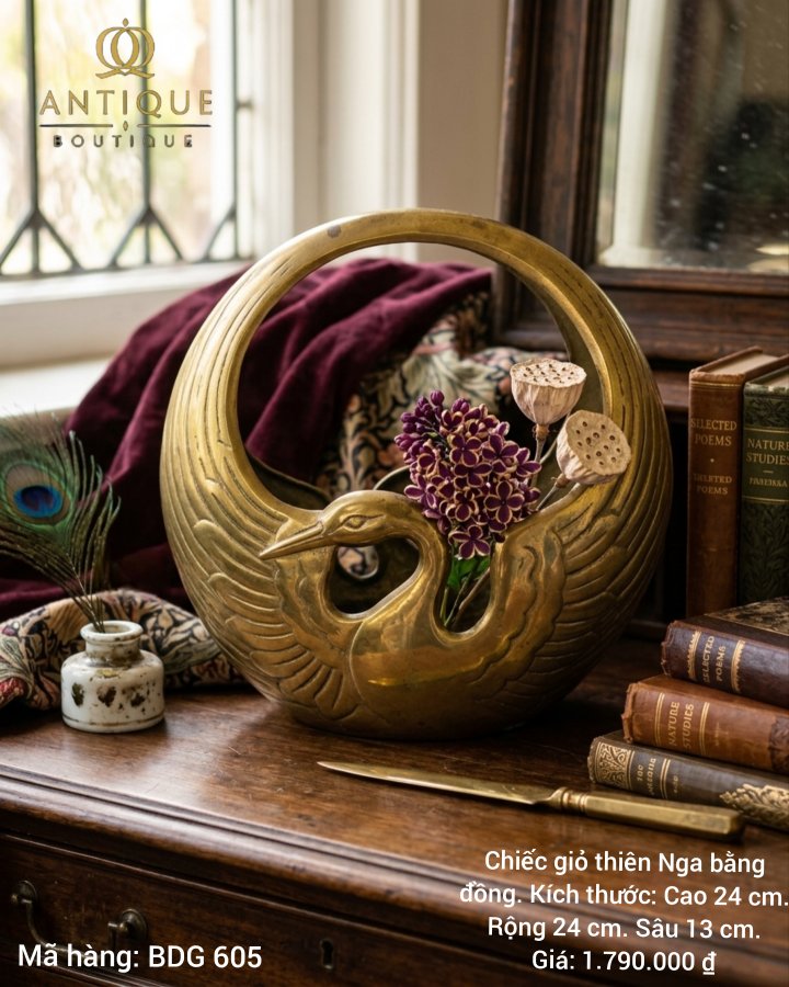 POEMS NATURE STUDICS Chiếc giỏ thiên Nga bằng đồng. Kích thước: Cao 24 cm. Rộng 24 cm.