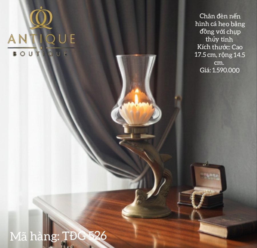 Chân đèn nến hình cá heo bằng đồng với chụp thủy tinh
