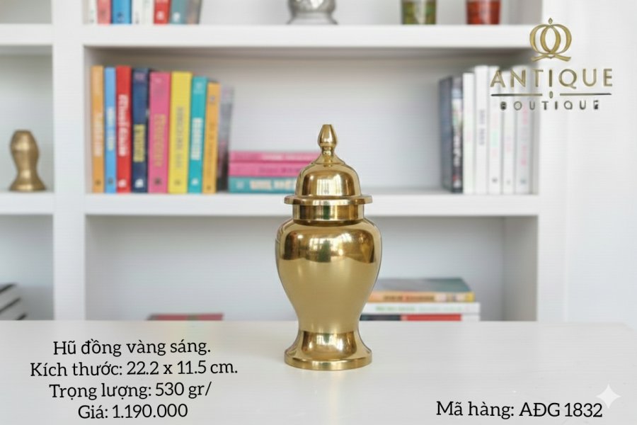 Hũ đồng vàng sáng. Kích thước: 22.2 x 11.5 cm. Trọng lượng: 530 gr