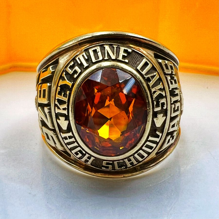 Nhẫn vàng 10k trường Keystone Oaks năm 1976 phôm bự hoa văn sắc nét đá vàng hổ phách đa gi