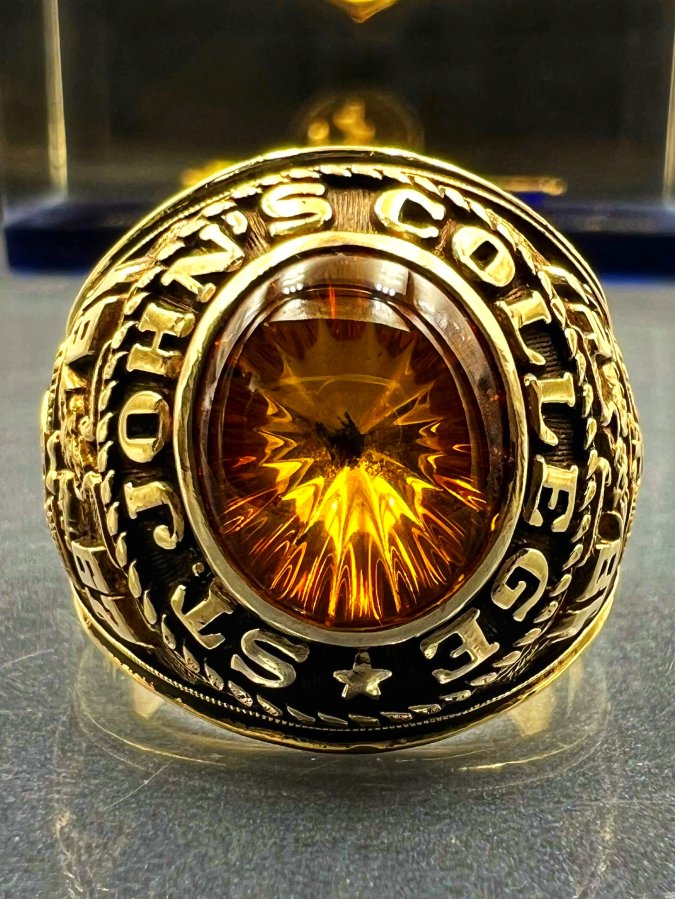 Nhẫn vàng 10k công giáo St.John's College năm 1967 phôm bự hoa văn sắc nét đá vàng tia mắt