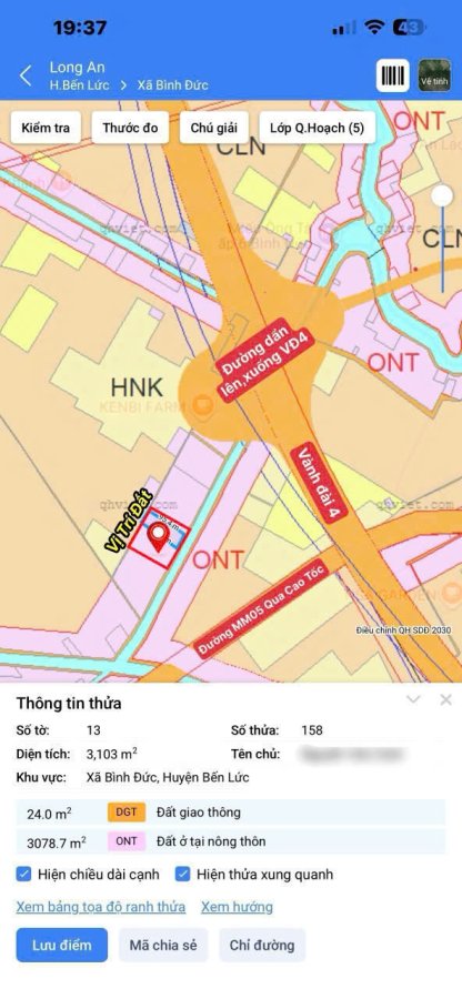 Bán đất thổ lúa vuông vức , đường beton xe 8 tấn Tân Bửu tdt 600m2 ( 150m2 thổ ) giá 6tỷ