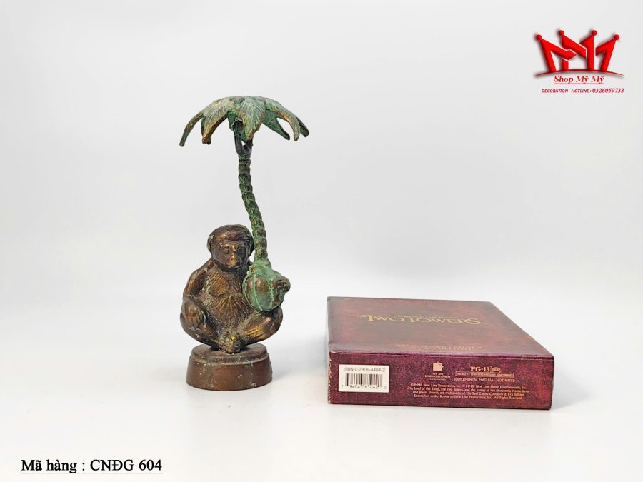 Chân nến hình chú khỉ đang ngồi ôm cây dừa làm bằng đồng.