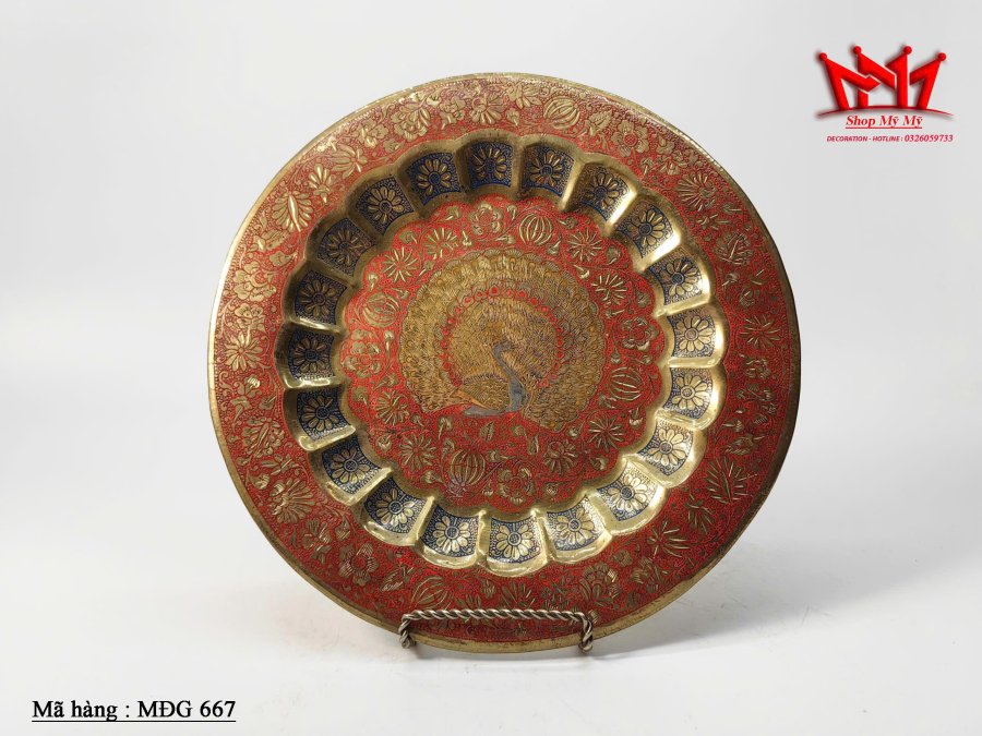 Mâm treo tường hình con công bằng đồng thau được chạm khắc thủ công.