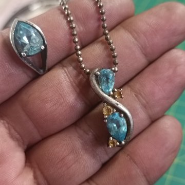 Nguyên bộ dây chuyền và nhẫn Bạc nguyên khối 925 đính đá Topal xanh hình giọt lệ