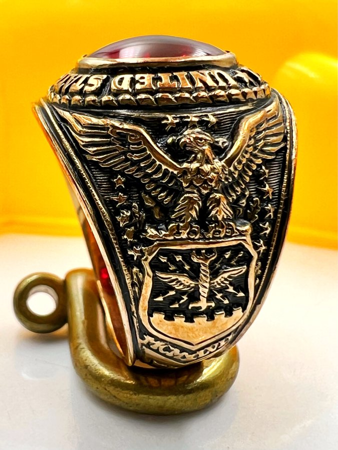 Nhẫn vàng 10k USAF Pilot năm 1950 phôm xưa hoa văn sắc nét đá đỏ huyết mo tròn rất đẹp, si