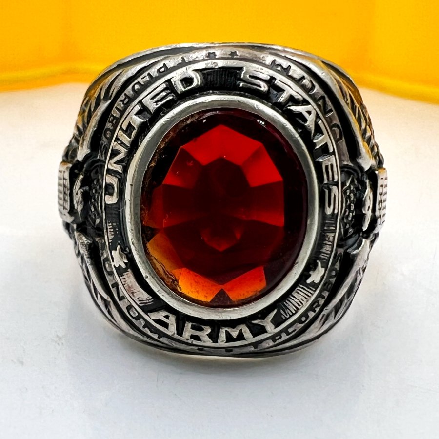 Nhẫn bạc thế chiến U.S Army Airborne hãng Crest Craft phôm xưa đá đỏ mo ốp logo rất đẹp, s