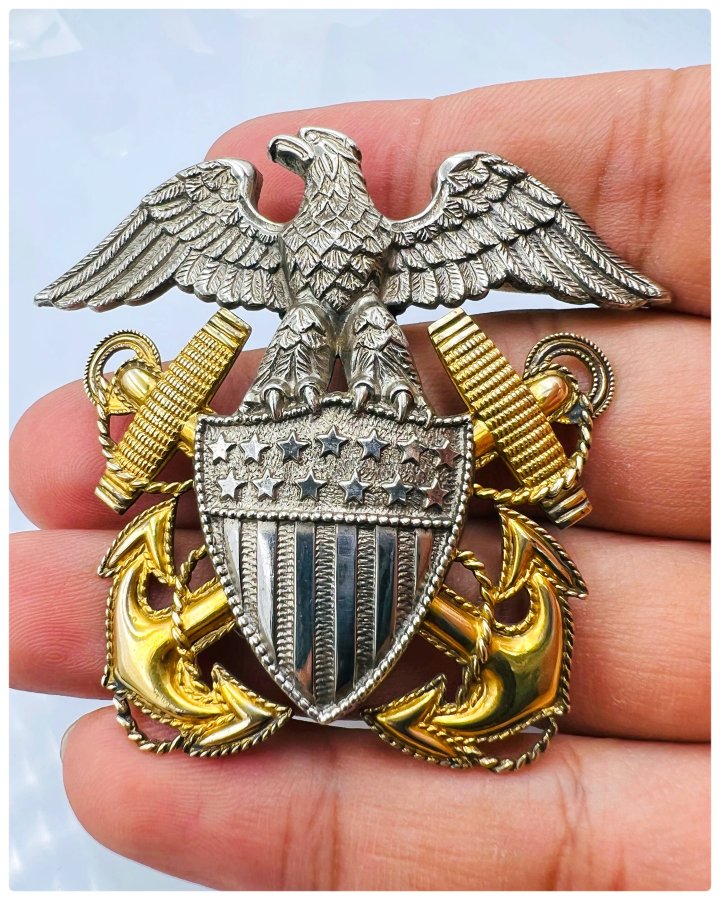 Huy hiệu U.S Navy bạc nguyên khối mỏ neo ốp vàng 10k dày 1/20 phôm bự mới tinh hoa văn sắc