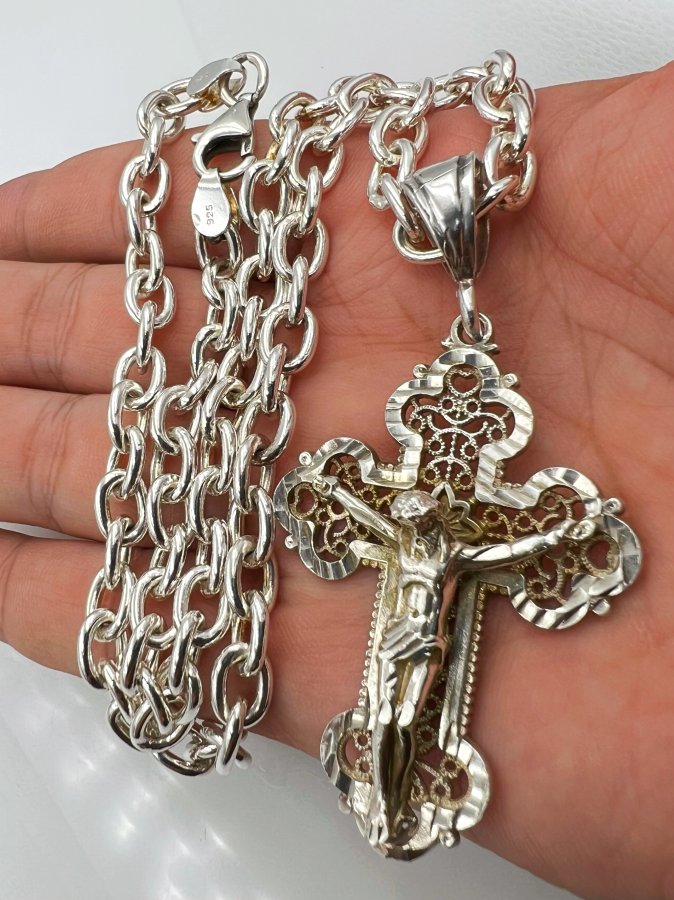 Bộ dây chuyền và mặt thánh giá bạc 925 italy phôm bự hoa văn sắc nét rất đẹp, dây dài 51cm