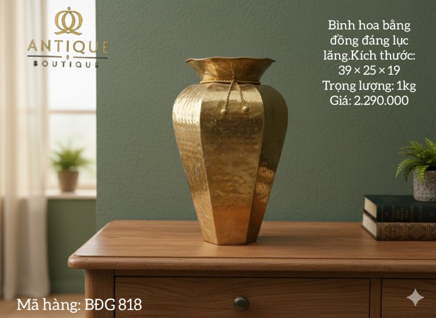 Bình hoa bằng đồng đập thủ công. Bình hình lục lăng có nơ