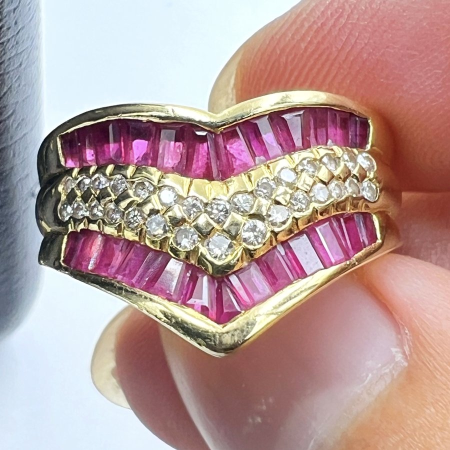 Nhẫn vàng 18k Nhật phôm bự hoa văn sắc nét đính ruby thiên nhiên 1.57ct và 30v soàn thiên