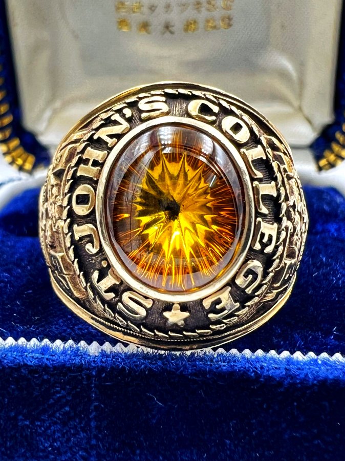 Nhẫn vàng 10k công giáo St.John's College năm 1967 phôm bự hoa văn sắc nét đá vàng tia mắt