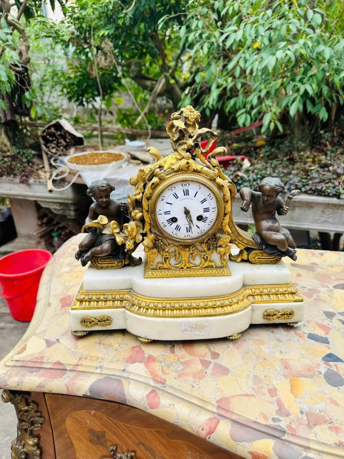 Đồng Hồ Tượng Pháp Cổ Lacke Vàng | Tích Cặp Cu Tí Bên Đồng Hồ
