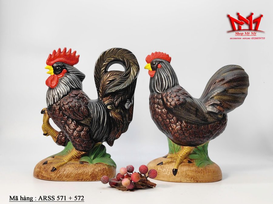 Cặp tượng trang trí hình cặp gà trống làm bằng sứ