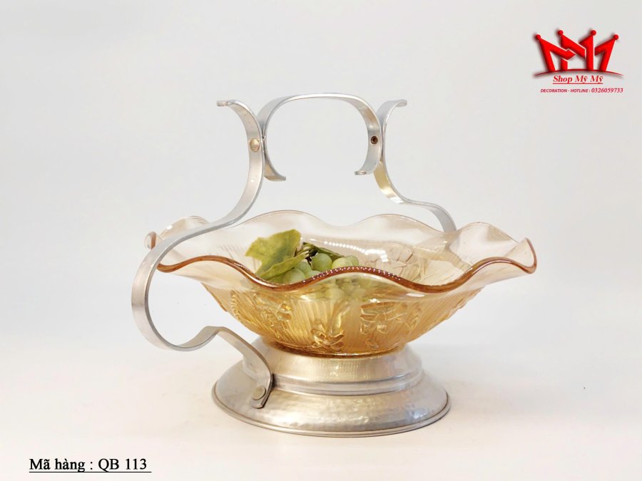 Bát hoa thủy tinh Carnival màu đào cổ điển có họa tiết nổi trên đế nhôm