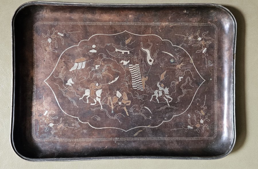 Khay trà Huế cẩn tam khí, bằng đồng chuẩn cổ.