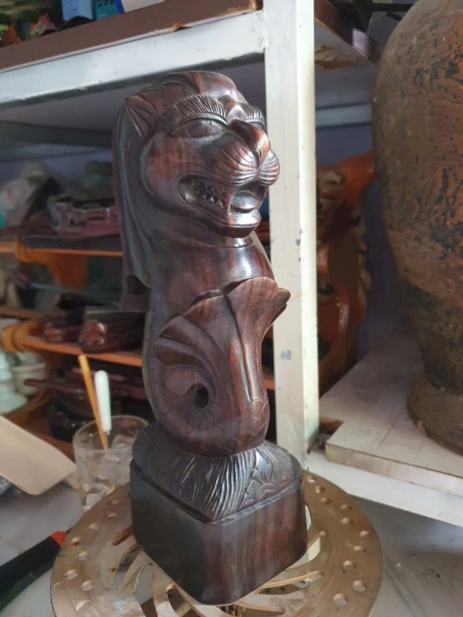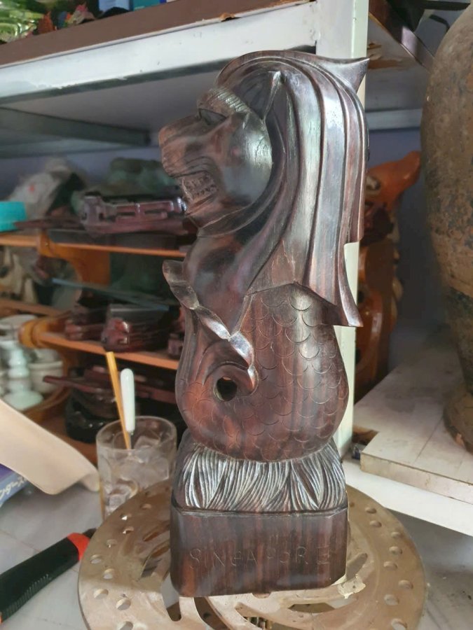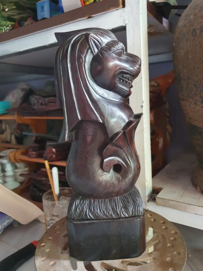 Sư tử biển biểu tượng Singapore bằng gỗ trắc.Nặng 2,1kg*cao 30,5cm*8,5cm*11 cm.Còn tem 1