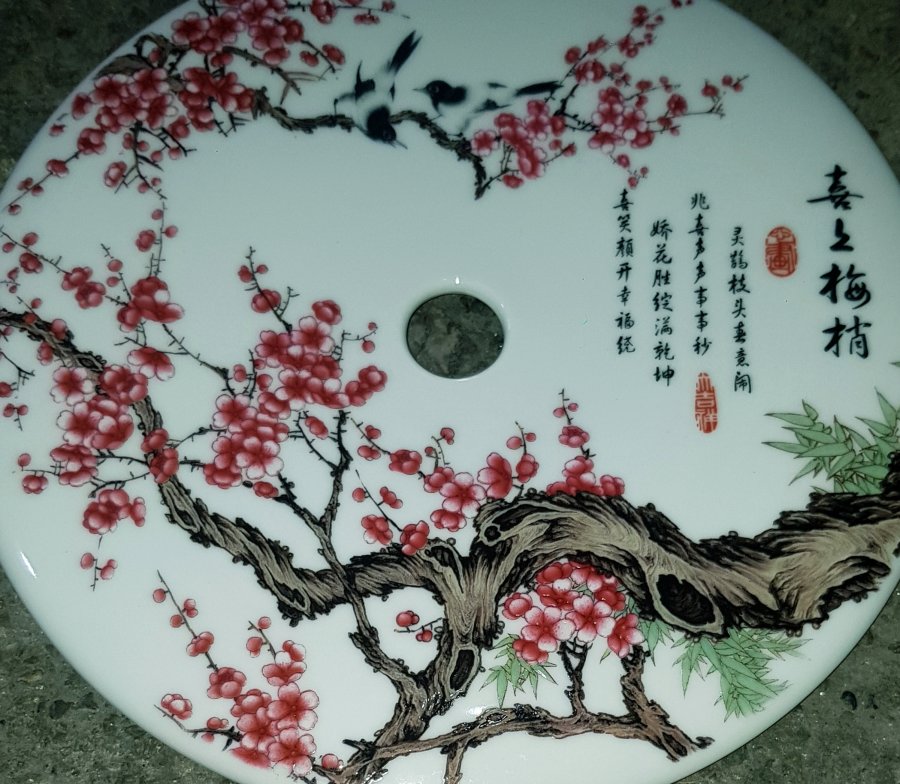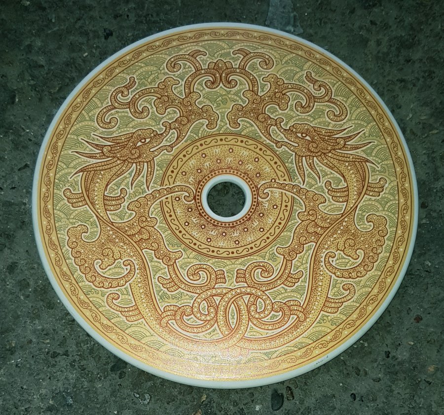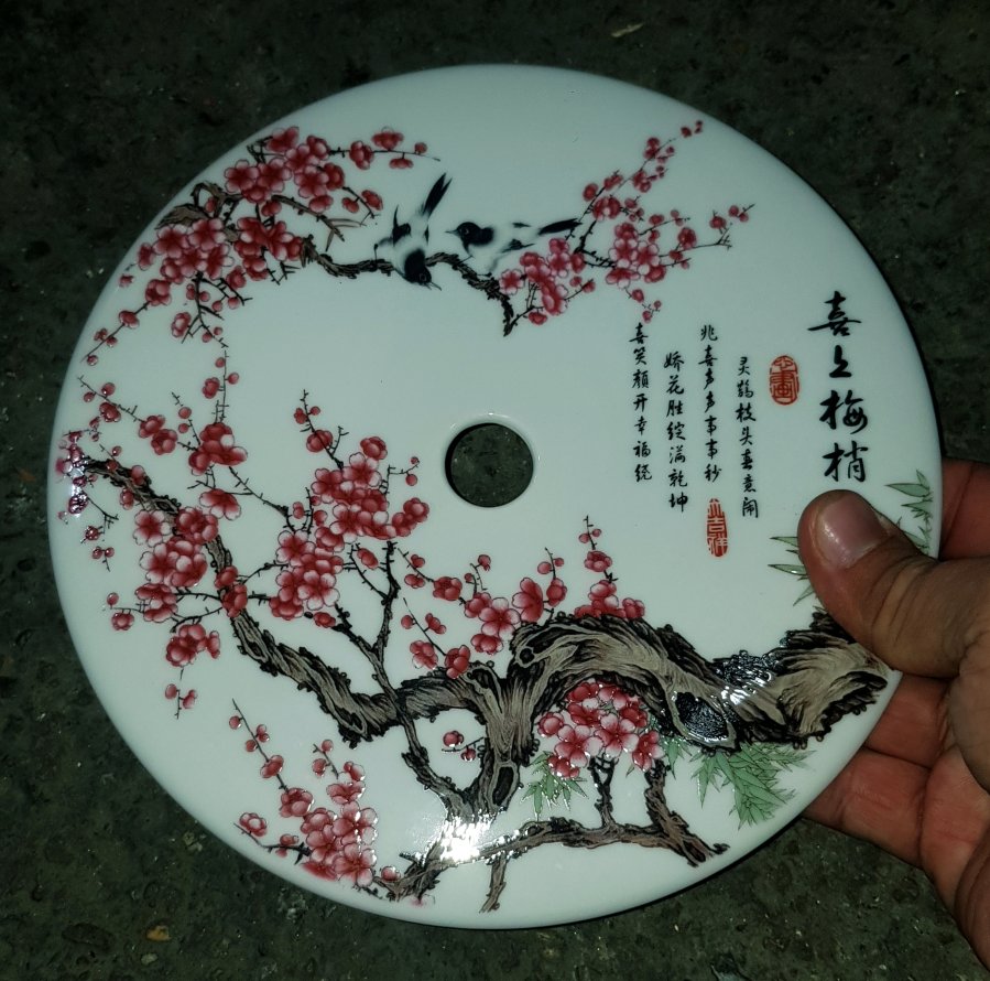 Tác phẩm sứ có lỗ ở giữa , 1 mặt vẽ chim hoa và thơ , 1 mặt là họa tiết rồng chầu như hình. đường kính 20.5cm. lành lặn GL950k