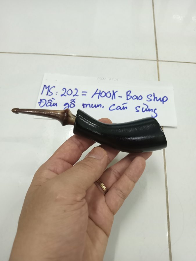 Tẩu hút sợi MS 202 . Đầu gỗ mun , cán sừng . Đường kính lò 18 mm , sâu 35 mm . Giá 400k bao ship . Alo 0933 888 298 có zalo