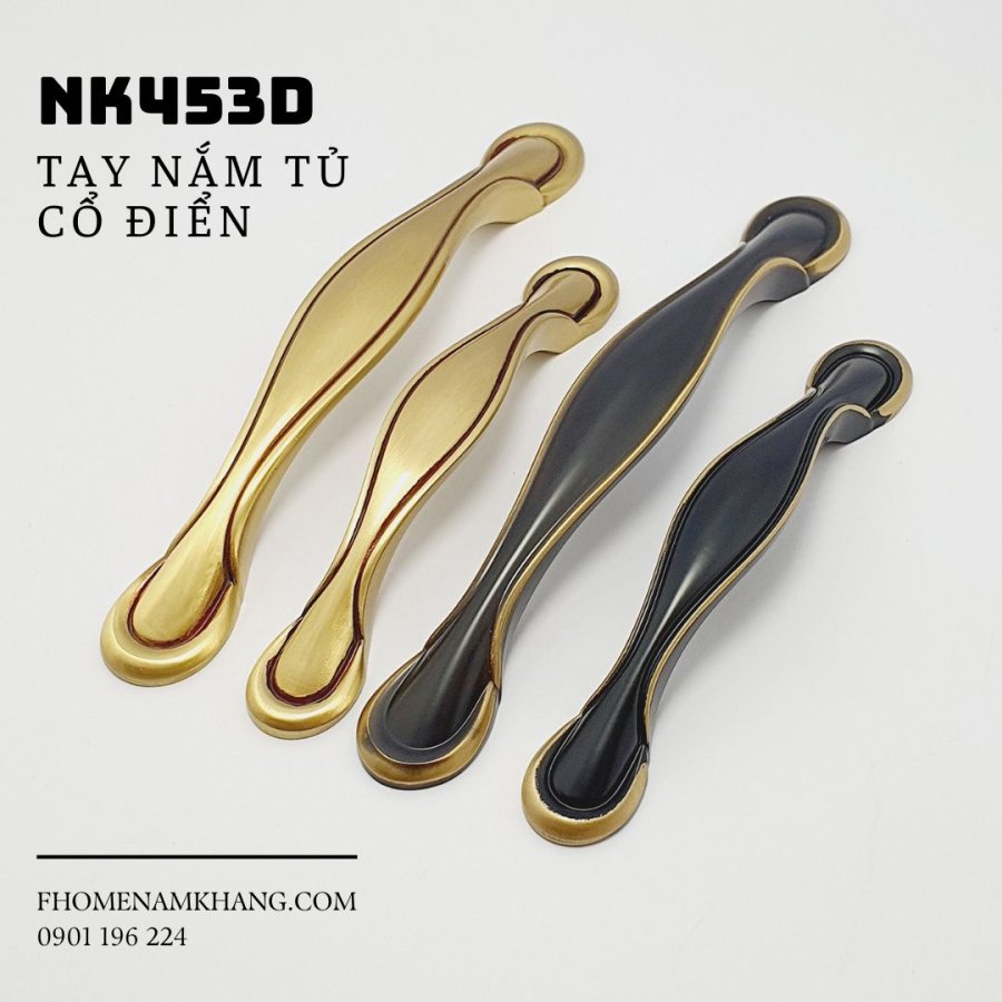 Tay nắm tủ NK453D với thiết kế uốn lượn tinh xảo, viền mạ vàng nổi bật trên nền đen hay vàng đồng cổ điển tạo nên vẻ đẹp đầy cuốn hút.