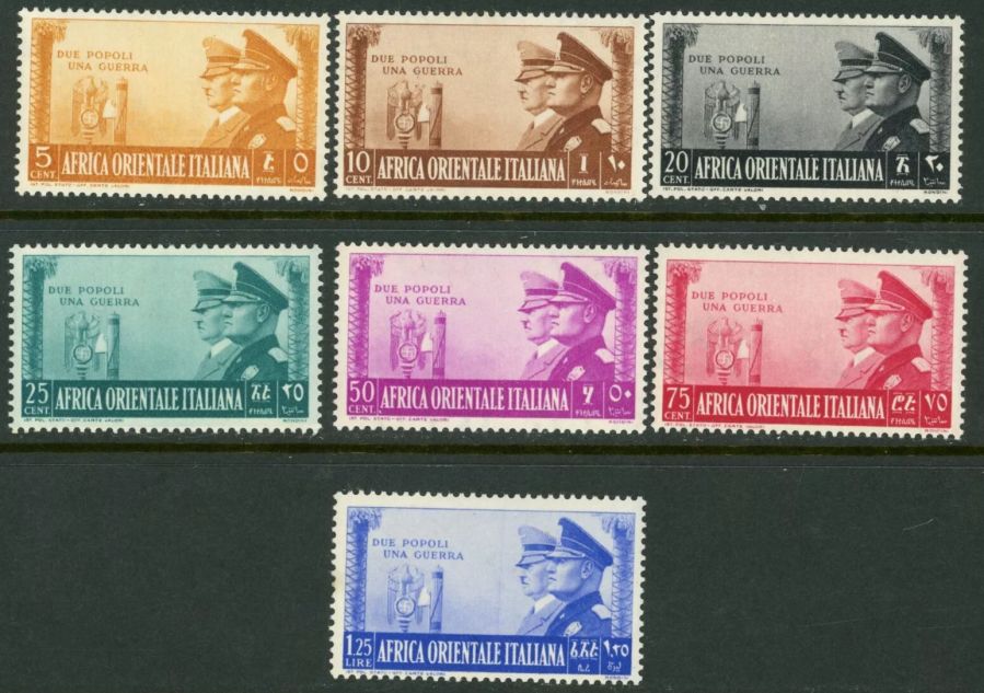 GO14: Bộ tem của vùng Đông Phi. Kỉ niệm liên minh Anh Em với Đức, in hình Hít Le và Mussolini năm 1941. Giá 850.000₫ (đã hàn phơi bảo quản)