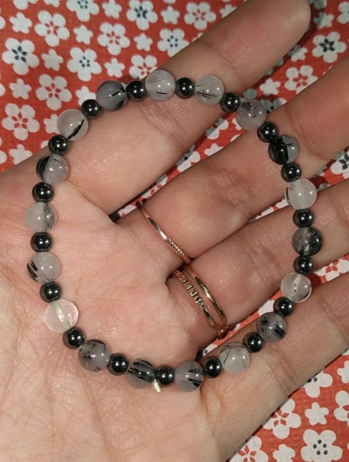 1 chiếc vòng đá Thạch Anh Tóc Tiên màu đen phối đá huyết áp nhí, vừa phóng thủy thủ hút tài lộc cho các nàng mệnh Mộc và Thủy, vừa ổn định huyết áp tốt cho sức khoẻ. Tiệm có 1 ạ, Tiệm mời khách 🥰
