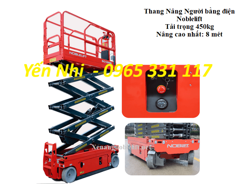 - Thang nâng người tự hành Noblelift SC10H: Chiều cao làm việc 8 mét, tải trọng nâng 230kg, phù hợp cho các công việc bảo trì và lắp đặt trong nhà xưởng và tòa nhà cao tầng.