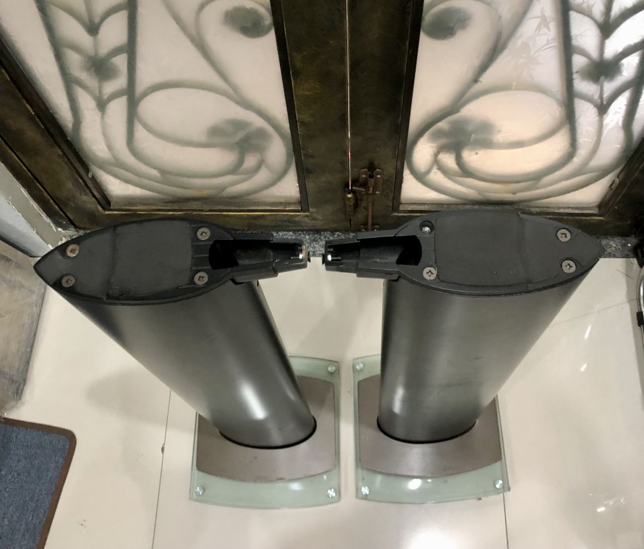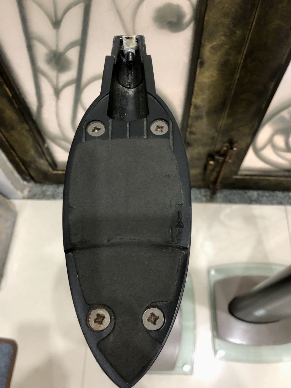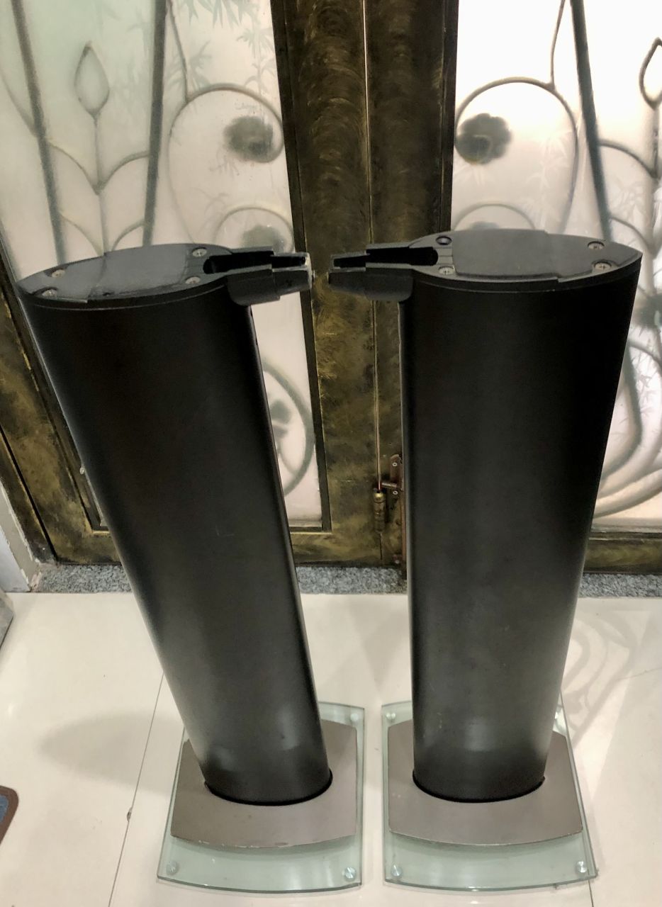 * chân zin . Cao ~65cm . Nặng ~ 10kg / cái , đế kính 10 ly có chân đinh phíp kèm khối nhôm nặng . Thân trụ hình cà na ~( 18 x 9 cm) . Chân có xây xước nhẹ