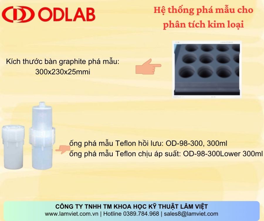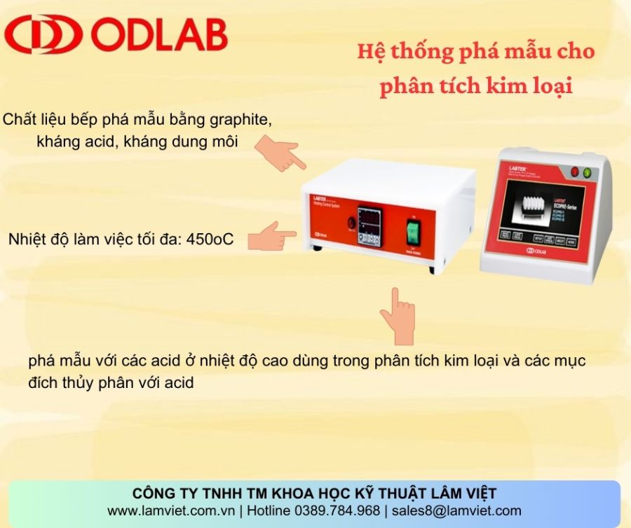 - Với thiết kế độc đáo và tính linh hoạt cao, ODLAB ECO-PRE HT được thiết kế để đáp ứng các yêu cầu khắt khe nhất của phân tích kim loại và thí nghiệm hóa học. Dùng để phá mẫu với các acid ở nhiệt độ cao, thiết bị này đảm bảo hiệu suất và độ chính xác cao trong quá trình phân tích.