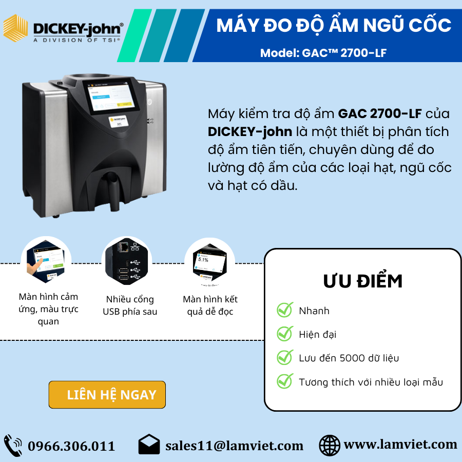 Máy kiểm tra độ ẩm GAC 2700-LF của ****EY-john là một thiết bị phân tích độ ẩm tiên tiến, chuyên dùng để đo lường độ ẩm, trọng lượng riêng và nhiệt độ của các loại hạt, ngũ cốc, và hạt có dầu. Thiết bị này tích hợp công nghệ cảm biến tần số cao 149 MHz, mang đến kết quả đo nhanh chóng, chính xác chỉ trong khoảng 20 giây, giúp tối ưu hóa quy trình kiểm tra chất lượng trong ngành nông nghiệp và công nghiệp chế biến thực phẩm.